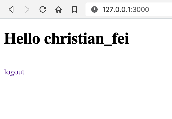 const TWITTER_CONSUMER_API_SECRET_KEY = process.env.npm_config_twitter_consumer_api_secret_key || process.env.TWITTER_CONSUMER_API_SECRET_KEYThe very simple HTTP server “dynamically“ renders an HTML page based on the signed in Twitter user, greeting them with their username: